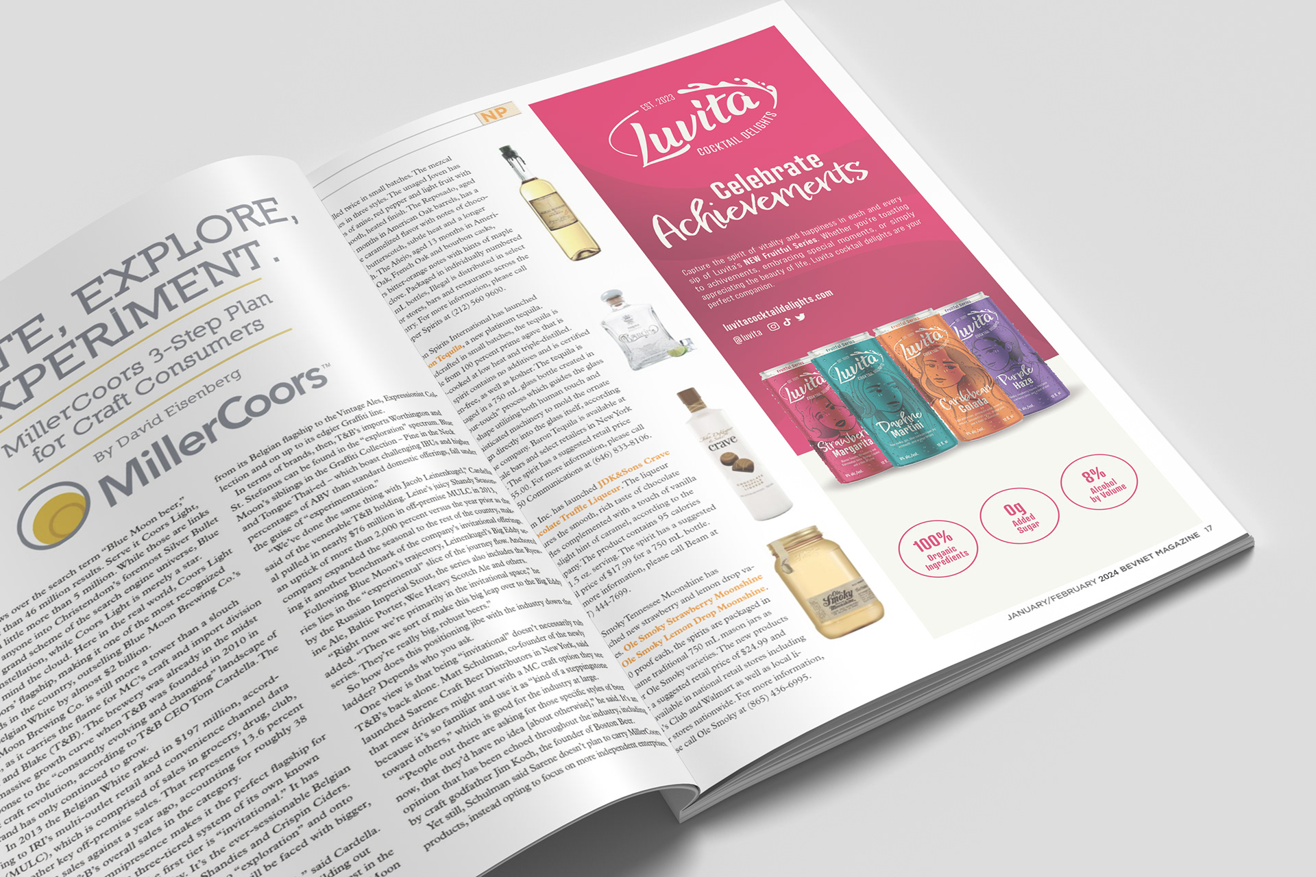 Create four labels for a fictitious beverage brand and a series of advertisements for a marketing campaign