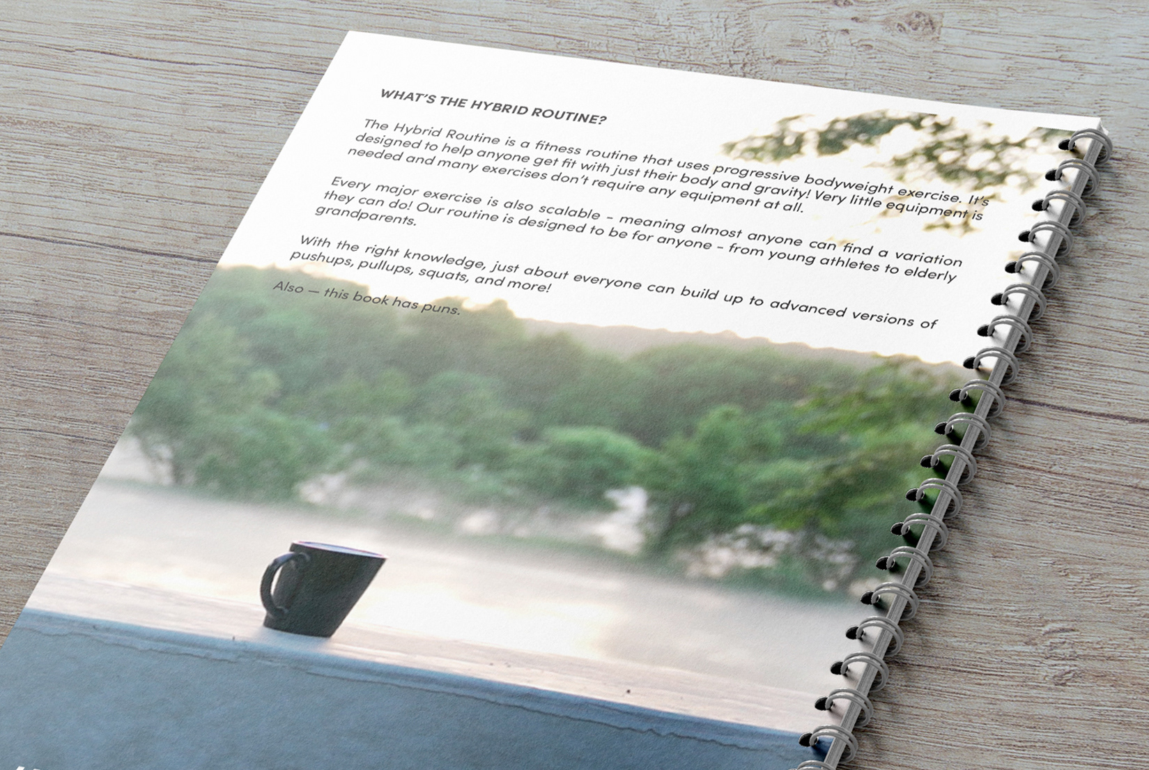 I connected with Hampton Liu, founder of Hybrid Calisthenics, through his community Discord channel. We discussed plans for many exercise and bodyweight projects for his growing brand and channels. For this project, I was the lead designer for creating different versions of a book showcasing the Hybrid Fitness Routine. I made design decisions for overall page layouts, integrating typographic hierarchy, creating an interactive table of contents, and touching up photography.